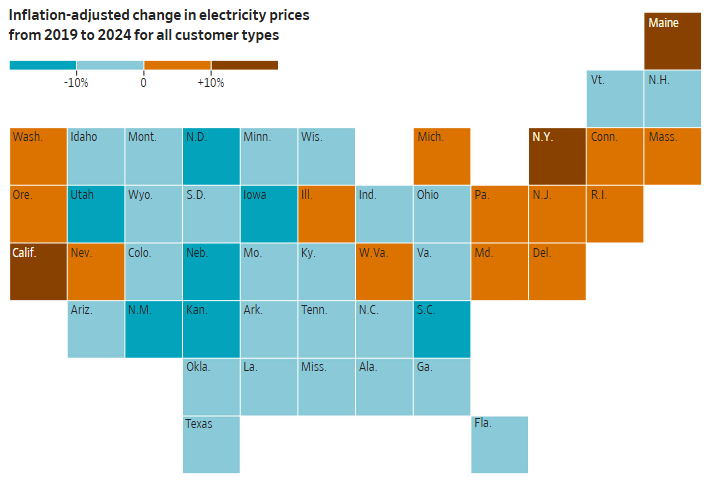 Outsize price shocks haven’t been universal. Customers in most U.S. states saw electricity-price increases that were lower than inflation from 2019 to 2024, according to a study led by Lawrence Berkeley National Laboratory.